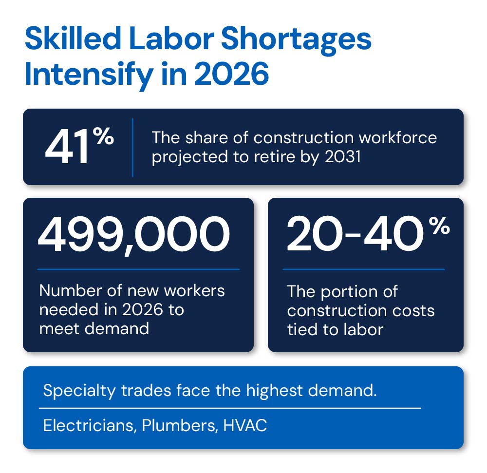 The construction industry is no stranger to labor shortages, but these challenges are reaching new severity in 2026. As existing workers age out, fewer young workers enter the trades, and tech-enabled talent becomes a must-have, skilled labor could become a primary constraint for many firms. Approximately 41% of the current construction workforce is expected to retire before 2031, underscoring the scope of the problem and showing how the shortage will compound year over year. Labor costs, which already represent 20 – 40% of total construction costs, could rise even higher as the problem grows more acute. Electricians, plumbers, HVAC specialists, and project managers will be in high demand. Double-digit wage increases for specialty trade contractors may become a new industry norm.